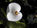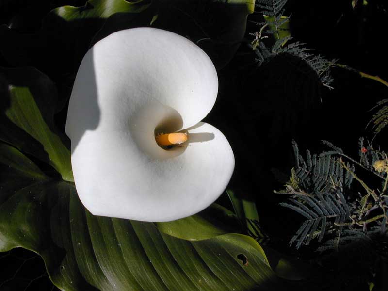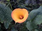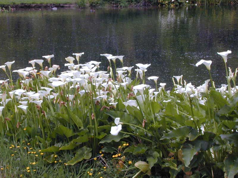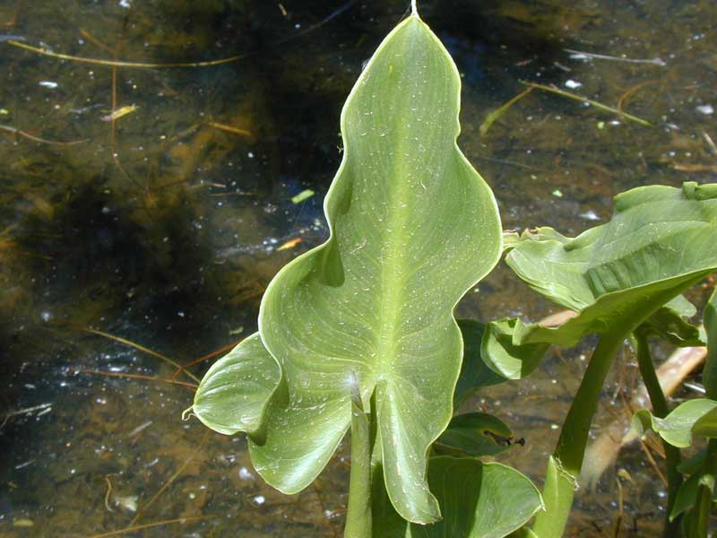 1.5m tall plant growing from rhizomes with large arrow head shaped leaves. Large flowers in spring and early summer. Natural type has white flowers, but various hybrids may have yellow or orange flowers and spotty leaves.