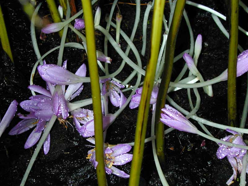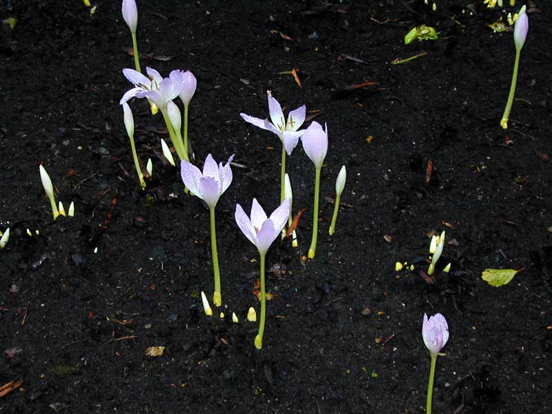 A variety of other species of Colchicum are planted in gardens: they are very similar but have bigger flowers. Also poisonous. True crocuses look similar but produce flowers and leaves at the same time.