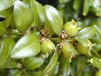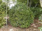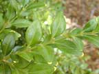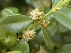 Box is an evergreen scrub, growing to 6 metres in height. The stems are very branched. The leaves are in pairs at the same level on opposite sides of the stem. They are 2 - 4cm long with a leathery texture and shiny appearance. The leaves are dark glossy green on the upper surface, lighter green or white beneath (variegated forms also exist). The flowers are small and pale green in colour, and are found in clusters between the stem and the leaf. The fruit are a blue green colour with a three horned capsules each containing six glossy black seeds.
