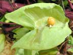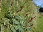Smelly soft wooded suckering shrub up to 2m tall or more. Large divided serrated leaves, strong smelling when crushed. Dark reddish brown flowers and papery swollen seed capsules on erect stem. Seeds are shining black when ripe.