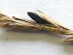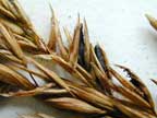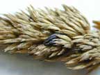 Ergot sclerotia (the resting phase between seasons, and the only visible part) is 10 - 35mm long, slender and curved, tapering to both ends, dark violet to black in colour, protrudes from the floret and occupy the position of seed of ryegrass or other grasses. Unpleasant odour with a sticky, honeydew phase.