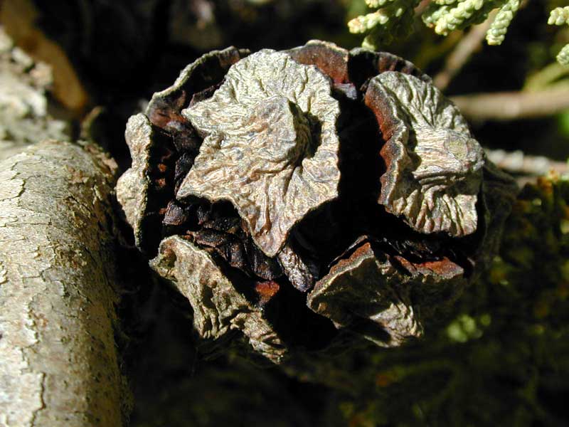 Old cone about to release its seeds. They can just be seen in the cracks. (January, Manawatu).