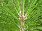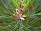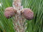 Large tree up to 60m. Older trees tend to be round topped; trees bred for timber are more conical. Needles are in clusters of three, about 15cm long. Female cones are egg shaped, asymmetrical and about 12 cm long.