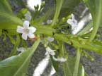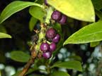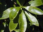 Shrub or small tree to 10m high, bark brown, thickened furrowed. Leaf buds sticky, blackish. Leaves oblong or obovate, 4-10 cm long, sharply pointed, minutely serrate above the middle, bright green finely dotted. Grow singly from alternate sides of stem. Small white flowers, with purple dots, arranged in clusters. Fruit an oblong, reddish purple drupe, in clusters of 3-6. glands in leaf