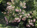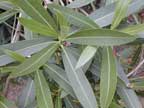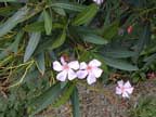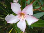 Ornamental woody, flowering evergreen shrub to 4m high. Dark green leaves are opposite in pairs or in whorls of 3 or 4, about 20 cm long, narrow and lance shaped, leathery with prominent midrib (can be variegated). Flowers red, pink or white up to 8cm diameter, funnel shaped and sometimes strongly scented. Fruit is cylindrical and up to 15 cm long.