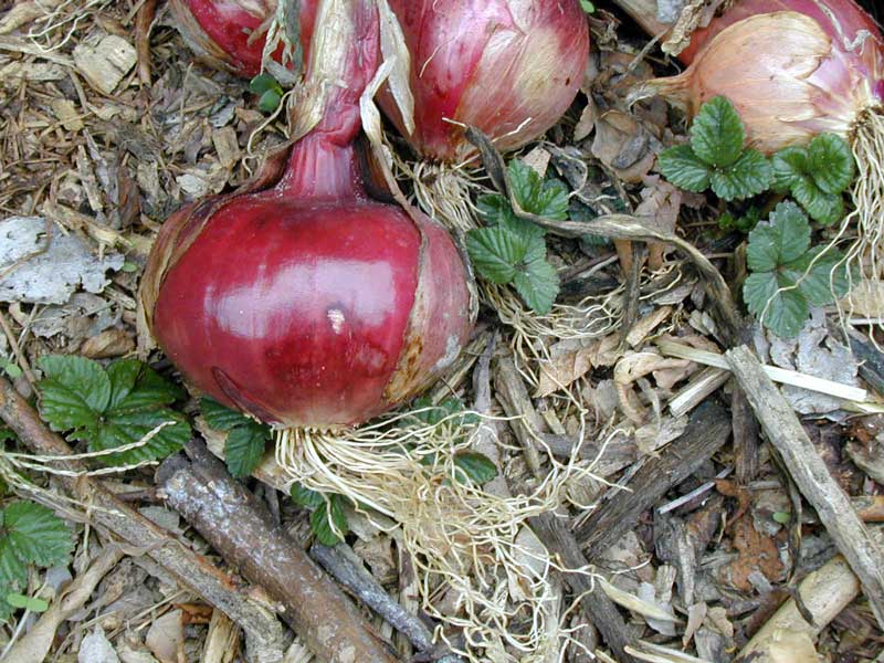 Californian Red onion bulb and roots. Pukekohe Long Keeper (white) is the commonest variety in NZ. (January, Manawatu).