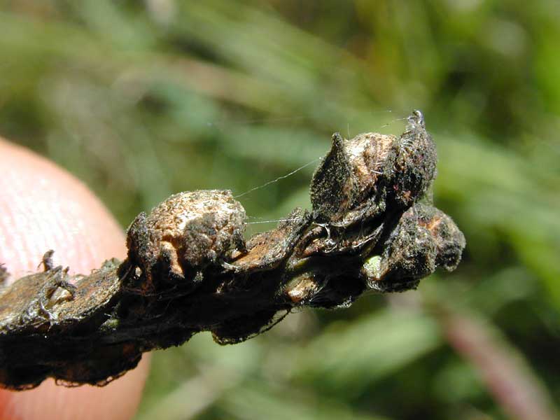 Ergots covered in honeydew growing black mould. (April, Manawatu).
