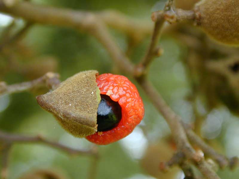 Seed emerging from capsule surrounded by the red aril. (January, Manawatu).